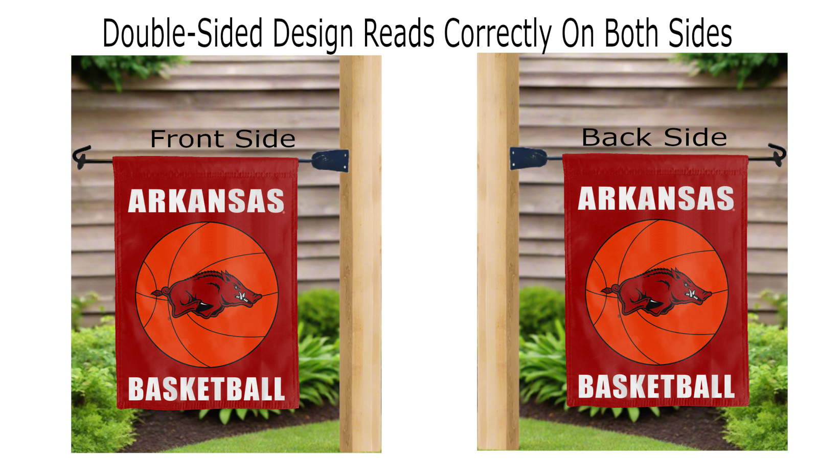 Decorate your yard with this Officially Licensed, 13" x 18" University of Arkansas Razorbacks Basketball Garden Flag! Made of 2-ply polyester, this flag is the result of two dye-sublimated flags sewn together with a middle liner sewn in between them to stop the see-through, allowing the University of Arkansas Basketball logo to look clear and read correctly on both sides. The sleeve across the top makes it easy for you to insert the flag into your garden flag stand. No matter who you are, this garden flag is a splendid choice for any University of Arkansas Razorbacks fans looking to add some flair to their yard, porch, entryway, or garden.