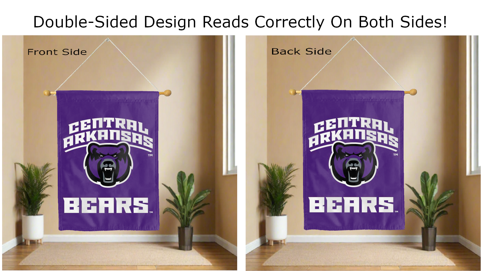Break the monotonous look of your room with this Officially Licensed University of Central Arkansas UCA Bears House Flag! Measuring 30" x 40", this house flag is the product of two screen-printed flags sewn together with a middle liner sewn in between the two flags to stop the see-through and allow the University of Central Arkansas UCA Bears logo to read correctly on both sides. The sleeve across the top also makes it easy to insert the flag into a flagpole or flag hanger if you choose to hang it outside your home. Regardless of where you choose to hang it, this University of Central Arkansas UCA Bears House Flag is sure to reflect your school pride any day of the week.