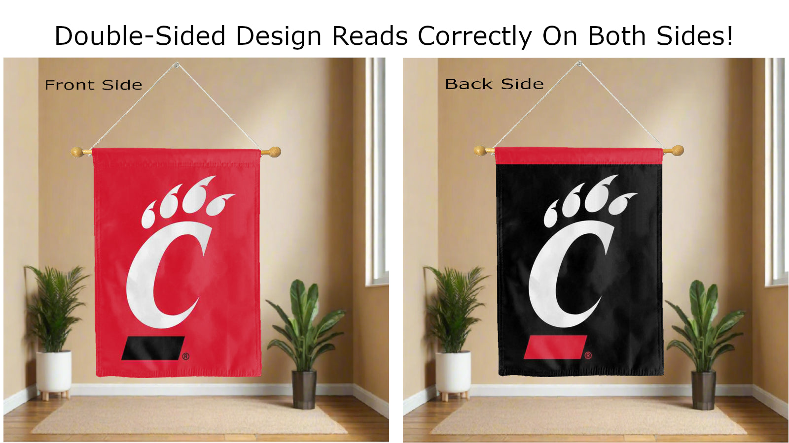 Break the monotonous look of your room with this Officially Licensed University of Cincinnati Double Sided House Flag! Measuring 30" x 40", this University of Cincinnati house flag is the product of two screen-printed flags sewn together with a middle liner sewn in between the two flags to stop the see-through and allow the University of Cincinnati 2 Sided C Paw logo to read correctly on both sides. The sleeve across the top also makes it easy to insert the flag into a flagpole or flag hanger if you choose to hang it outside your home. Regardless of where you choose to hang it, this University of Cincinnati Double Sided House Flag is sure to reflect your school pride any day of the week.
