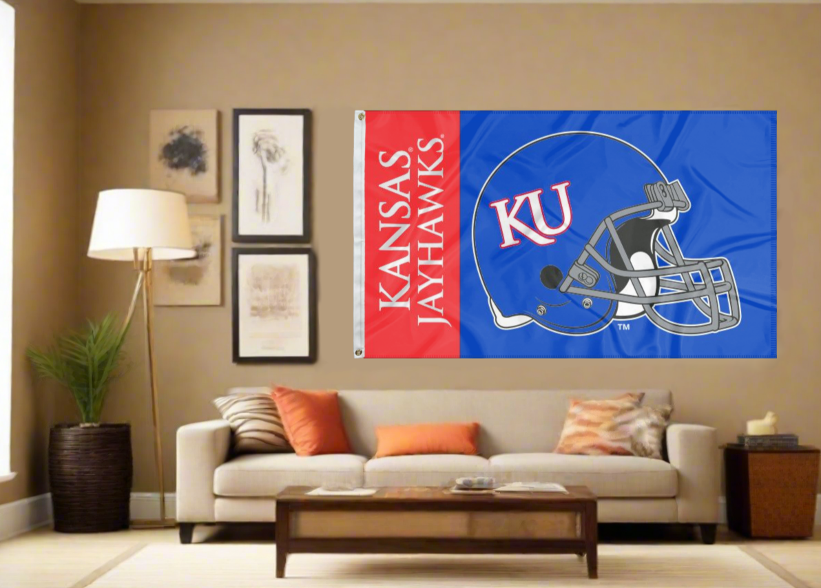 Show your school pride with this 3' x 5' Kansas flag. Equipped with two metal grommets for attaching to your flagpole, this silk-screen printed polyester flag is also fade resistant. This flag features quadruple parameter stitching to give it strength and durability. it is also viewable on both sides with the back side being the reverse image. Suitable for the most dedicated fan, this Officially Licensed Jayhawks Football flag is sure to make your yard a hit on game day.