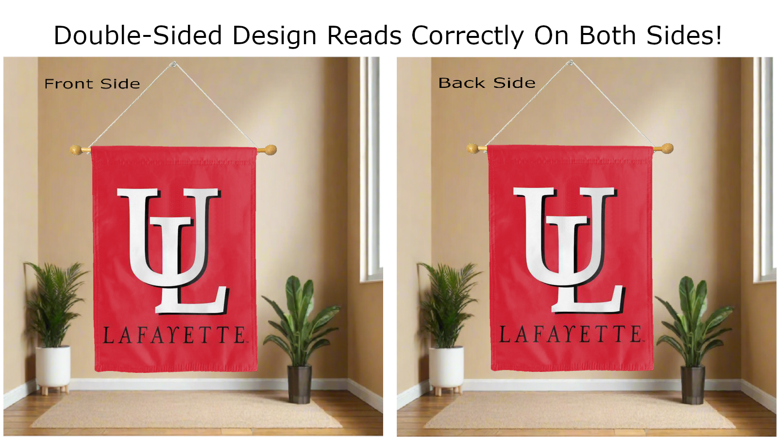 Break the monotonous look of your room with this Officially Licensed Louisiana Lafayette UL Lafayette Double Sided House Flag! Measuring 30" x 40", this house flag is the product of two screen-printed flags sewn together with a middle liner sewn in between the two flags to stop the see-through and allow the logo to read correctly on both sides. The sleeve across the top also makes it easy to insert the flag into a flagpole or flag hanger if you choose to hang it outside your home. Regardless of where you choose to hang it, this Louisiana Lafayette Double Sided House Flag is sure to reflect your school pride any day of the week.