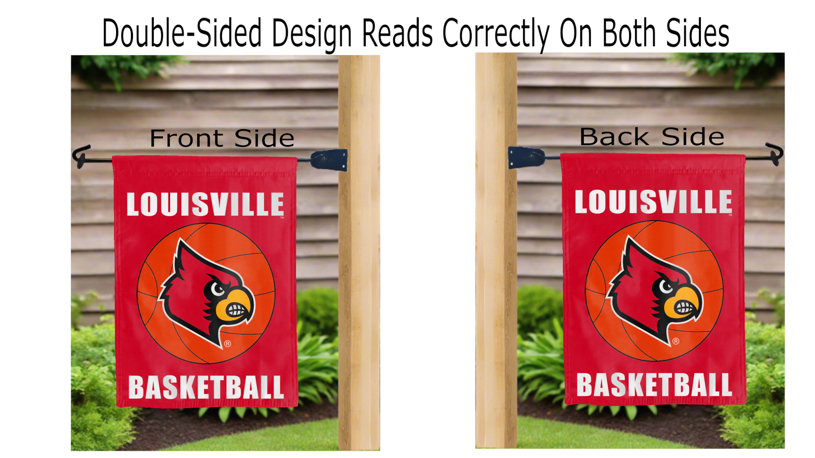 louisville basketball logo reading correctly on both sides of red double sided garden flag