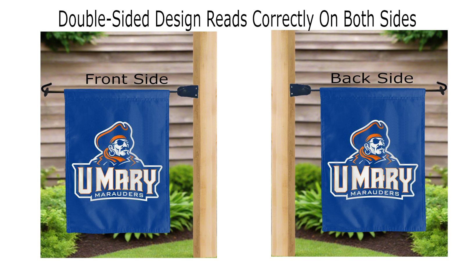 umary marauders logo reading correctly on both sides of blue double sided garden flag