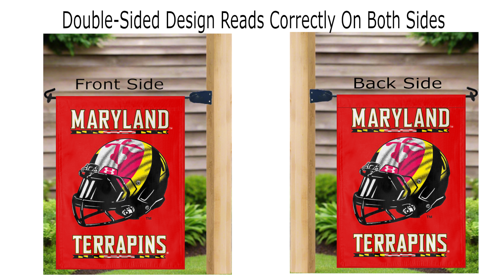 Let your voice scream "Go Terrapins!" with this NCAA Officially Licensed 13" x 18" University of Maryland Football Garden flag! Made of 2-ply polyester, this flag is the result of two dye-sublimated flags sewn together with a middle liner sewn in between them to stop the see-through, allowing the logo to look clear and read correctly on both sides. The sleeve across the top makes it easy for you to insert the flag into your garden flag stand. No matter where you are, this garden flag is sure to make it clear your loyalty lies with the Terrapins on game day.