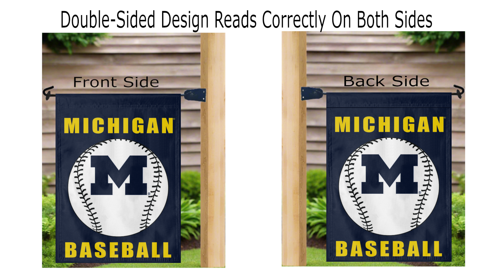 This double-sided garden flag proudly showcases the Michigan Baseball logo correctly on both sides, making your team spirit stand out no matter where you stand. The sleeve at the top makes it quick and easy to hang on a garden flag stand outside or on a banner pole inside your Wolverine fan cave.