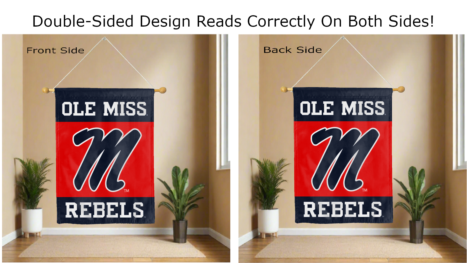 Break the monotonous look of your room with this Officially Licensed Mississippi Ole Miss Rebels House Flag! Measuring 30" x 40", this house flag is the product of two screen-printed flags sewn together with a middle liner sewn in between the two flags to stop the see-through and allow the logo to read correctly on both sides. The sleeve across the top also makes it easy to insert the flag into a flagpole or flag hanger if you choose to hang it outside your home. Regardless of where you choose to hang it, this Mississippi Ole Miss Rebels House Flag is sure to reflect your school pride any day of the week.