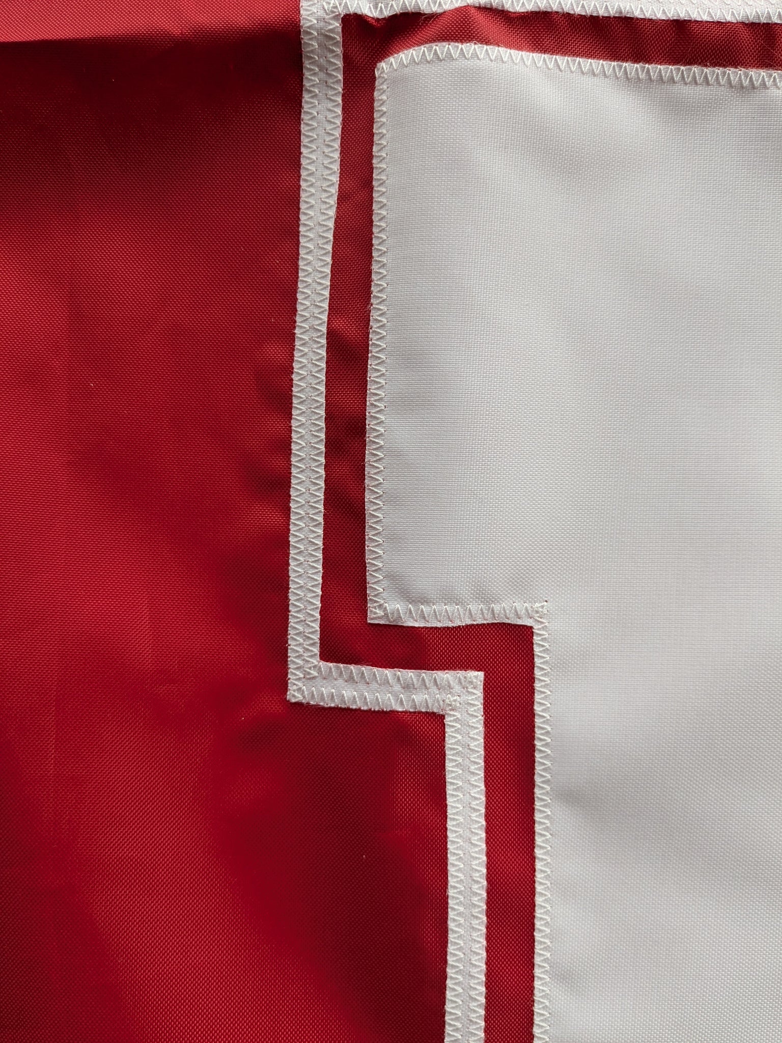 Close up shot of white hand-sewn nebraska huskers logo on red university of nebraska applique flag