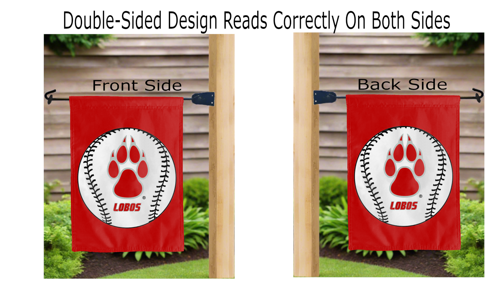 The Lobos Baseball logo reads correctly on both sides of this 13" x 18" double-sided garden flag, allowing anyone passing by to see where you stand on game day from any angle. The sleeve at the top makes it quick and easy to hang on a garden flag stand or banner pole.