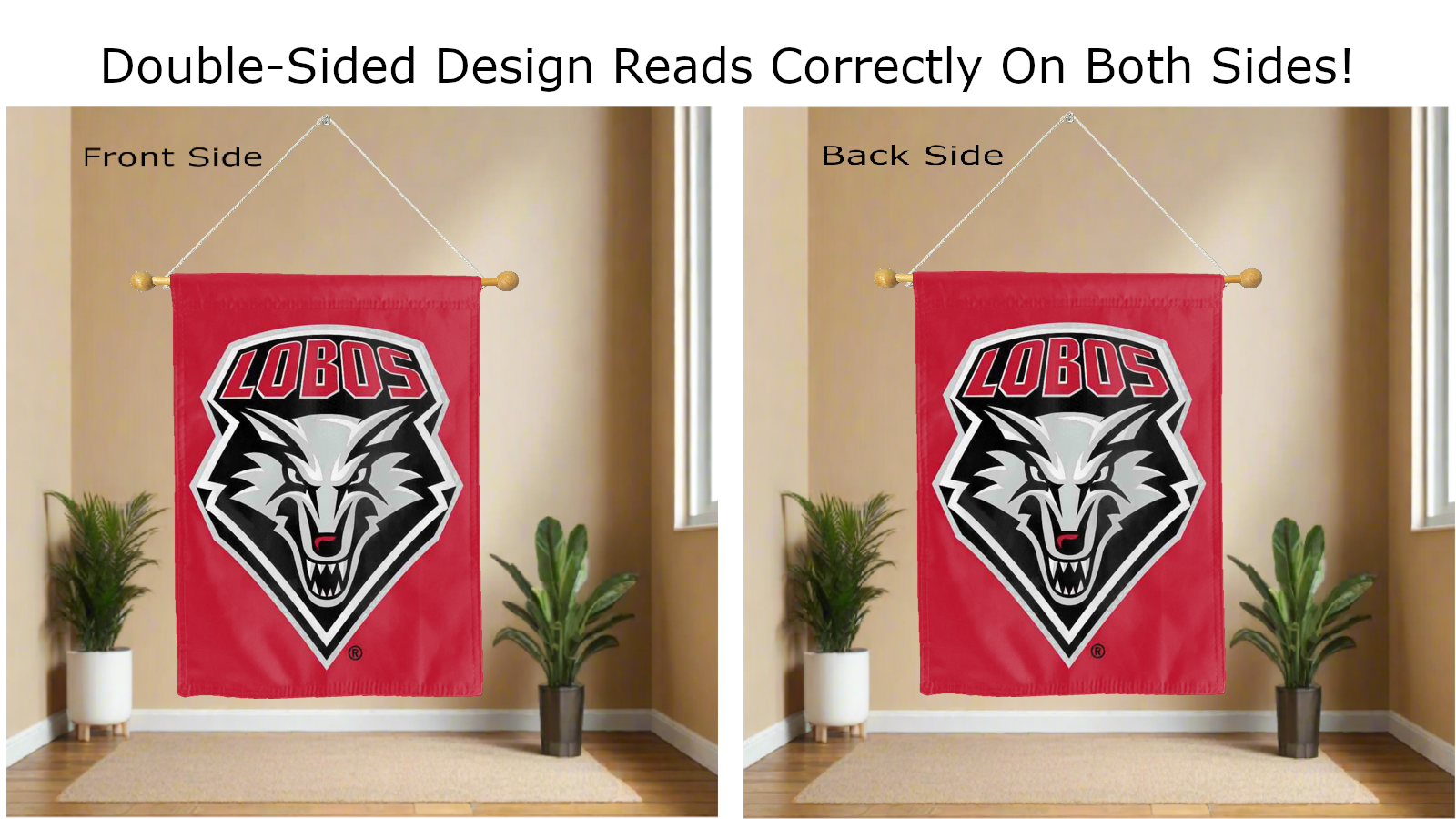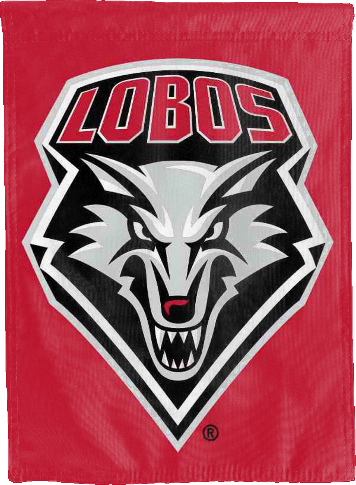 new mexico lobos logo reading correctly on both sides of red double sided house flag