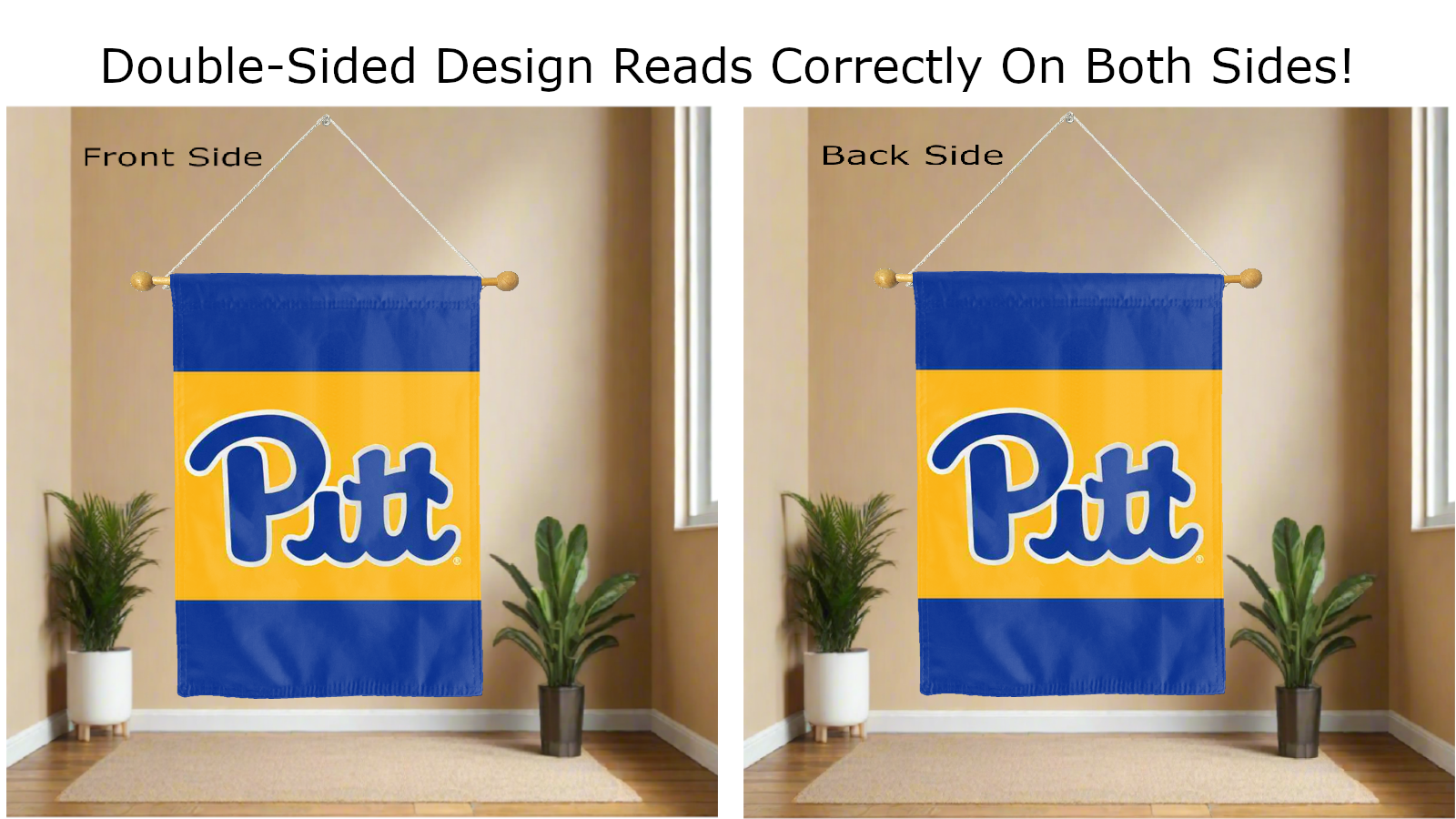 Break the monotonous look of your room with this Officially Licensed University of Pittsburgh Double Sided House Flag! Measuring 30" x 40", this house flag is the product of two screen-printed flags sewn together with a middle liner sewn in between the two flags to stop the see-through and allow the logo to read correctly on both sides. The sleeve across the top also makes it easy to insert the flag into a flagpole or flag hanger if you choose to hang it outside your home. Regardless of where you choose to hang it, this University of Pittsburgh Double Sided House Flag is sure to reflect your school pride any day of the week.