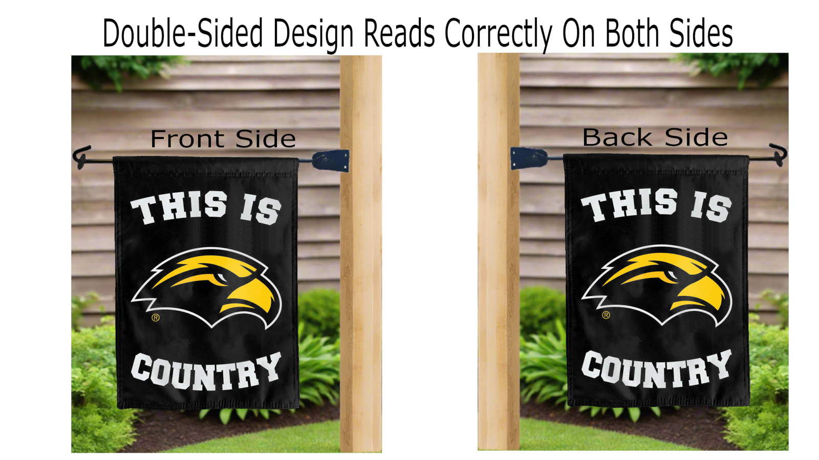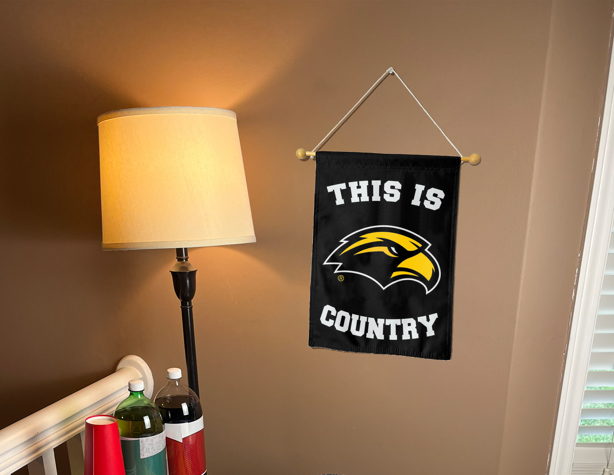 Let your voice scream "Go Golden Eagles!" with this NCAA Officially Licensed, 13" x 18" University of Southern Mississippi This Is Southern Miss Golden Eagles Country Garden flag! Made of 2-ply polyester, this flag is the result of two dye-sublimated flags sewn together with a middle liner sewn in between them to stop the see-through, allowing the logo to look clear and read correctly on both sides. The sleeve across the top makes it easy for you to insert the flag into your garden flag stand. No matter where you are, this garden flag is sure to make it clear your loyalty lies with the Golden Eagles on game day.