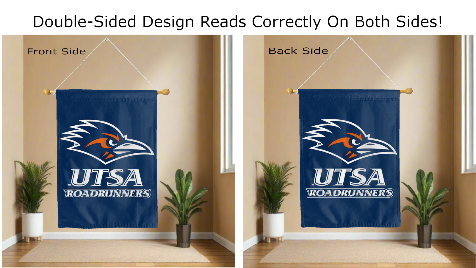 Break the monotonous look of your room with this Officially Licensed UT San Antonio Roadrunners House Flag! Measuring 30" x 40", this house flag is the product of two screen-printed flags sewn together with a middle liner sewn in between the two flags to stop the see-through and allow the logo to read correctly on both sides. The sleeve across the top also makes it easy to insert the flag into a flagpole or flag hanger if you choose to hang it outside your home. Regardless of where you choose to hang it, this UT San Antonio Roadrunners House Flag is sure to reflect your school pride any day of the week.