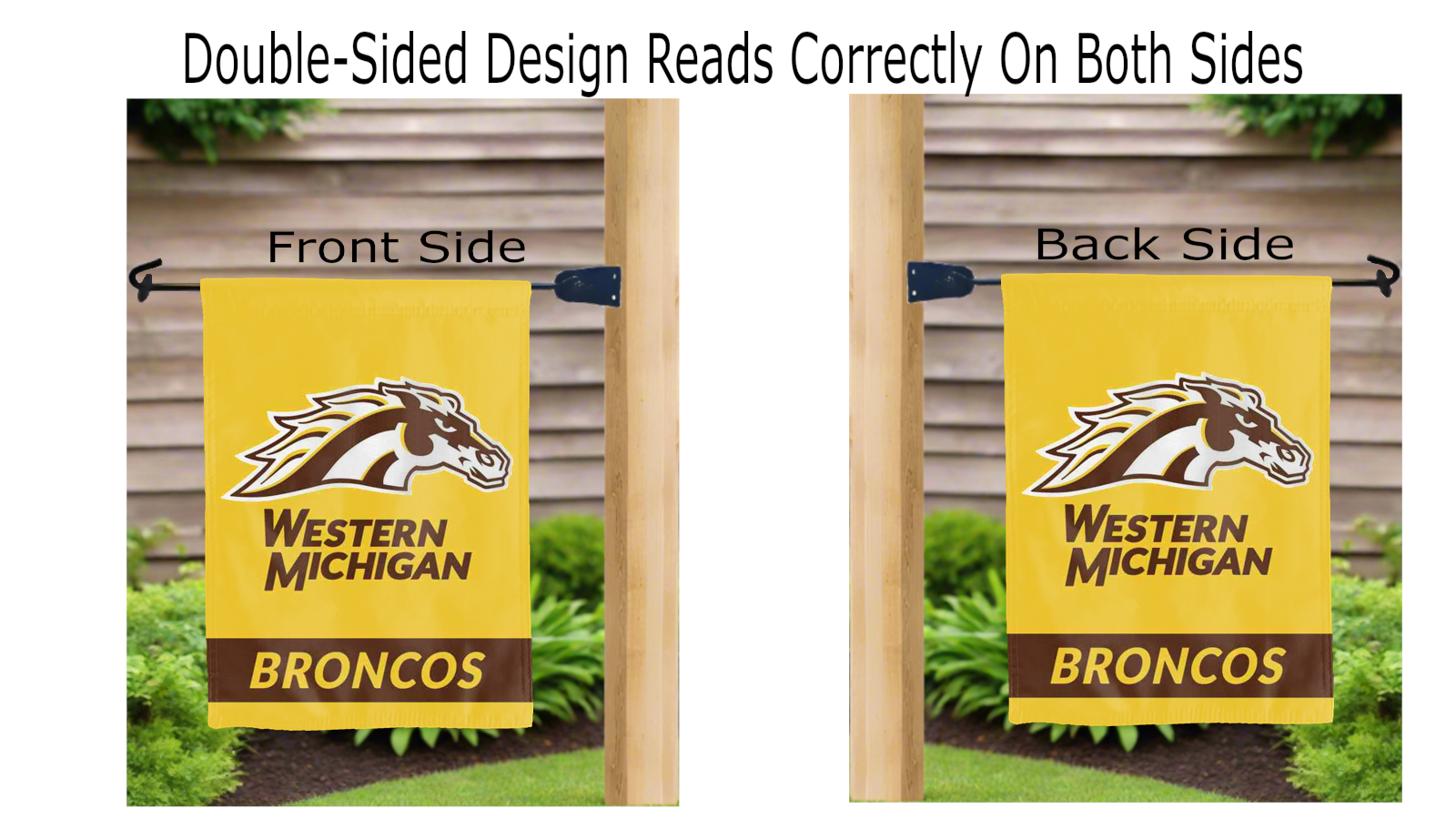 western michigan broncos logo reading correctly on both sides of garden flag
