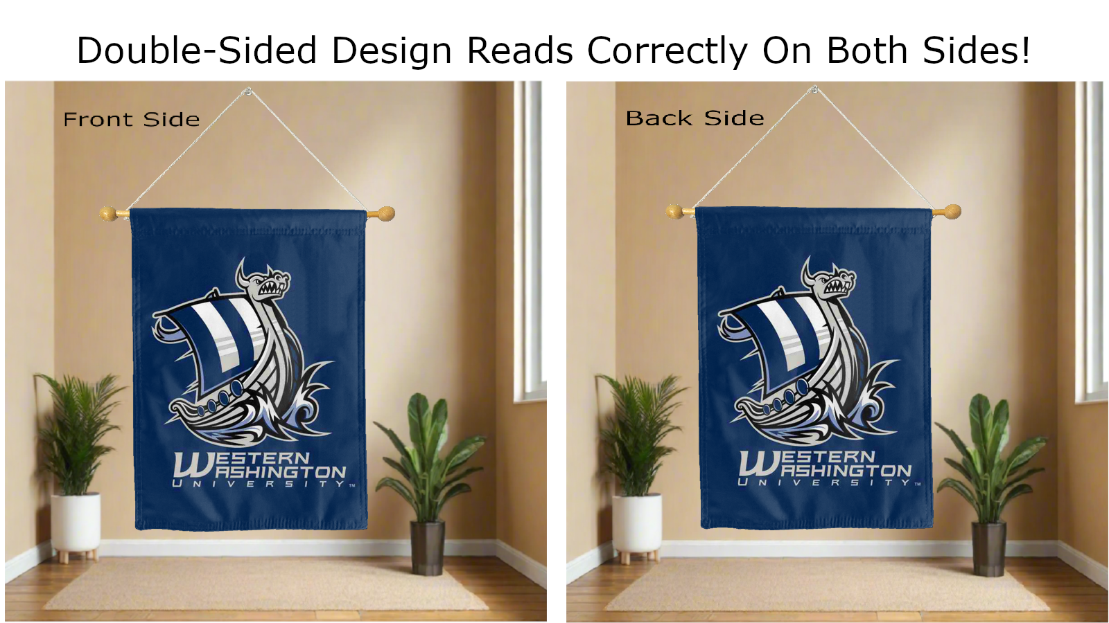 Break the monotonous look of your room with this Officially Licensed Western Washington University Vikings Ship Double Sided House Flag! Measuring 30" x 40", this house flag is the product of two screen-printed flags sewn together with a middle liner sewn in between the two flags to stop the see-through and allow the Western Washington University Vikings Ship logo to read correctly on both sides. The sleeve across the top also makes it easy to insert the flag into a flagpole or flag hanger if you choose to hang it outside your home. Regardless of where you choose to hang it, this Western Washington University Vikings Ship Double Sided House Flag is sure to reflect your school pride any day of the week.
