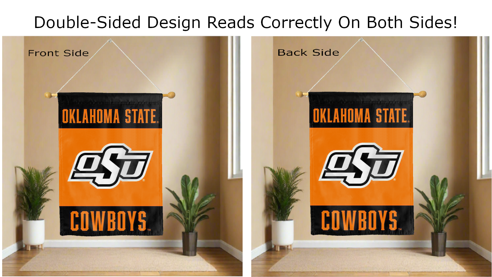 Break the monotonous look of your room with this Officially Licensed Oklahoma State OSU Cowboys Double Sided House Flag! Measuring 30" x 40", this house flag is the product of two screen-printed flags sewn together with a middle liner sewn in between the two flags to stop the see-through and allow the Oklahoma State Logo and OSU Cowboys logo to read correctly on both sides. The sleeve across the top also makes it easy to insert the flag into a flagpole or flag hanger if you choose to hang it outside your home. Regardless of where you choose to hang it, this Oklahoma State Cowboys Double Sided House Flag is sure to reflect your school pride any day of the week.
