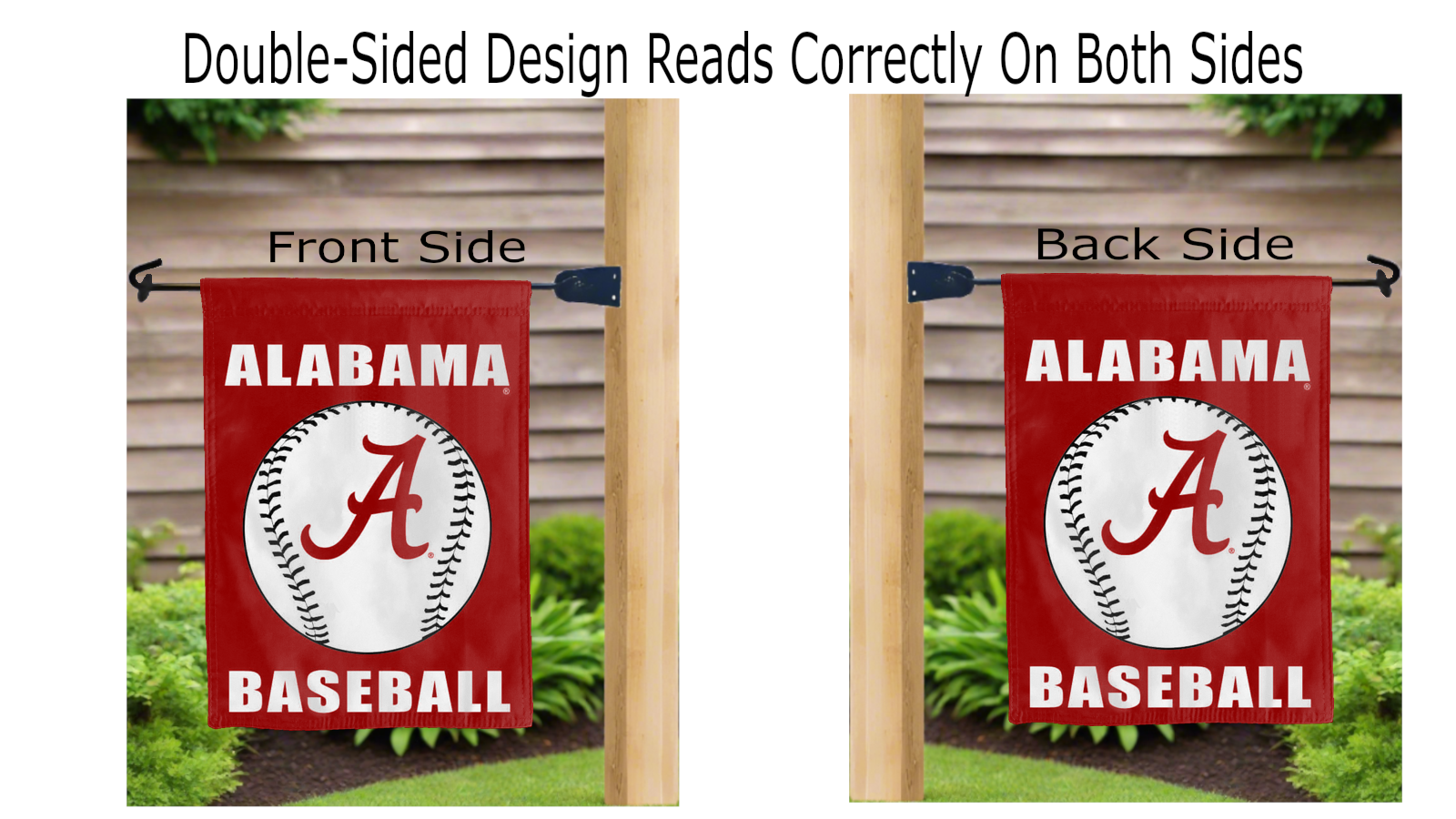Decorate your yard with this Officially Licensed, 13" x 18" University of Alabama Baseball Garden Flag! Made of 2-ply polyester, this flag is the result of two dye-sublimated flags sewn together with a middle liner sewn in between them to stop the see-through, allowing the University of Alabama Baseball logo to look clear and read correctly on both sides. The sleeve across the top makes it easy for you to insert the flag into your garden flag stand. No matter where you are, this garden flag is sure to make it clear your loyalty lies with the University of Alabama Crimson Tides on game day.